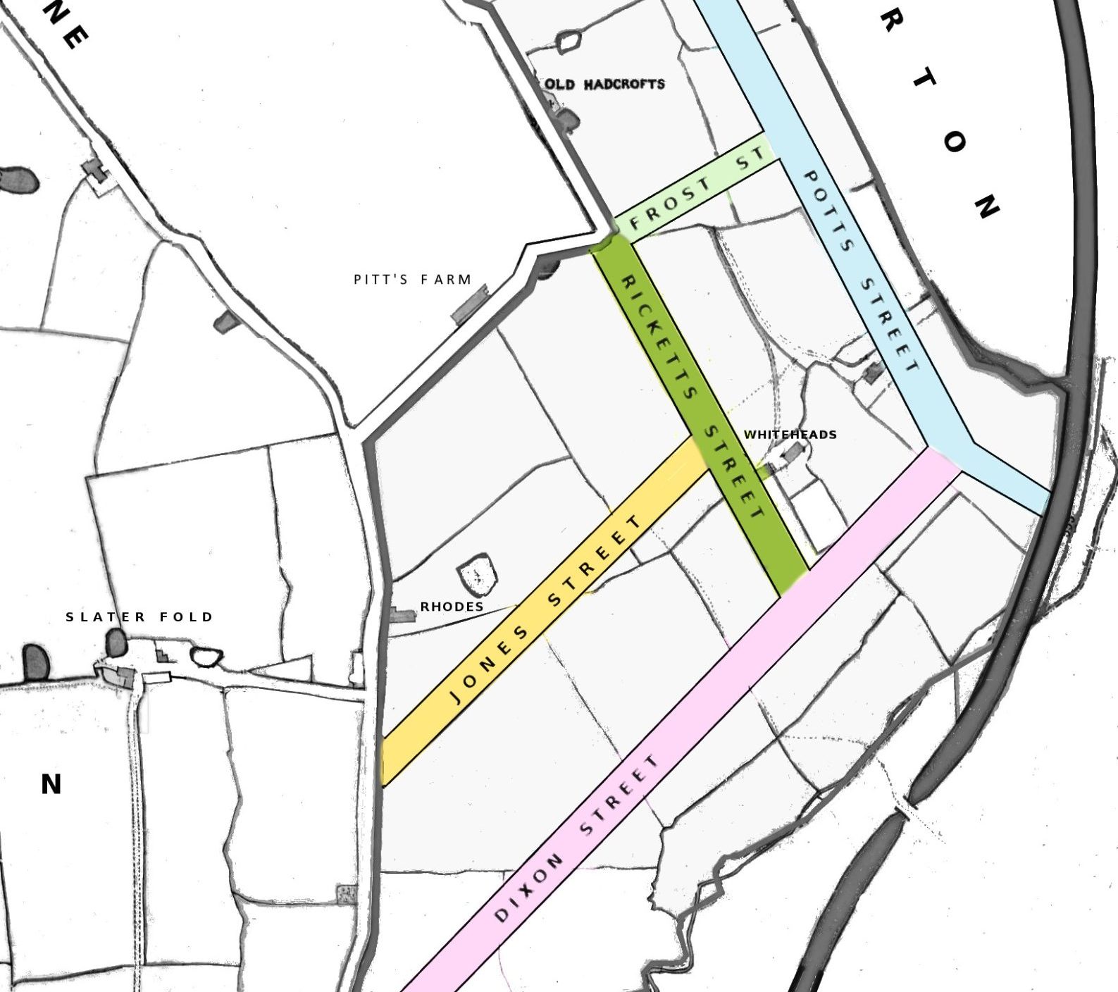Soon after this date, five streets were formed – Dixon Street, Ricketts Street, Potts Street, Jones Street and Frost Street. These were later renamed Belgrave Road, Parkfield Road North, Northfield Road, Eastwood Road and – combined with the existing Scholes Lane, past Pitt’s Farm – Hawthorn Road respectively.