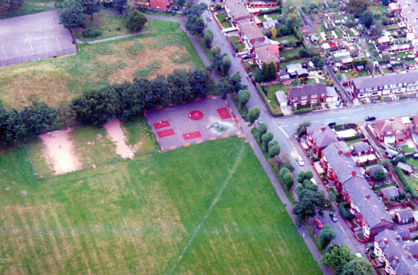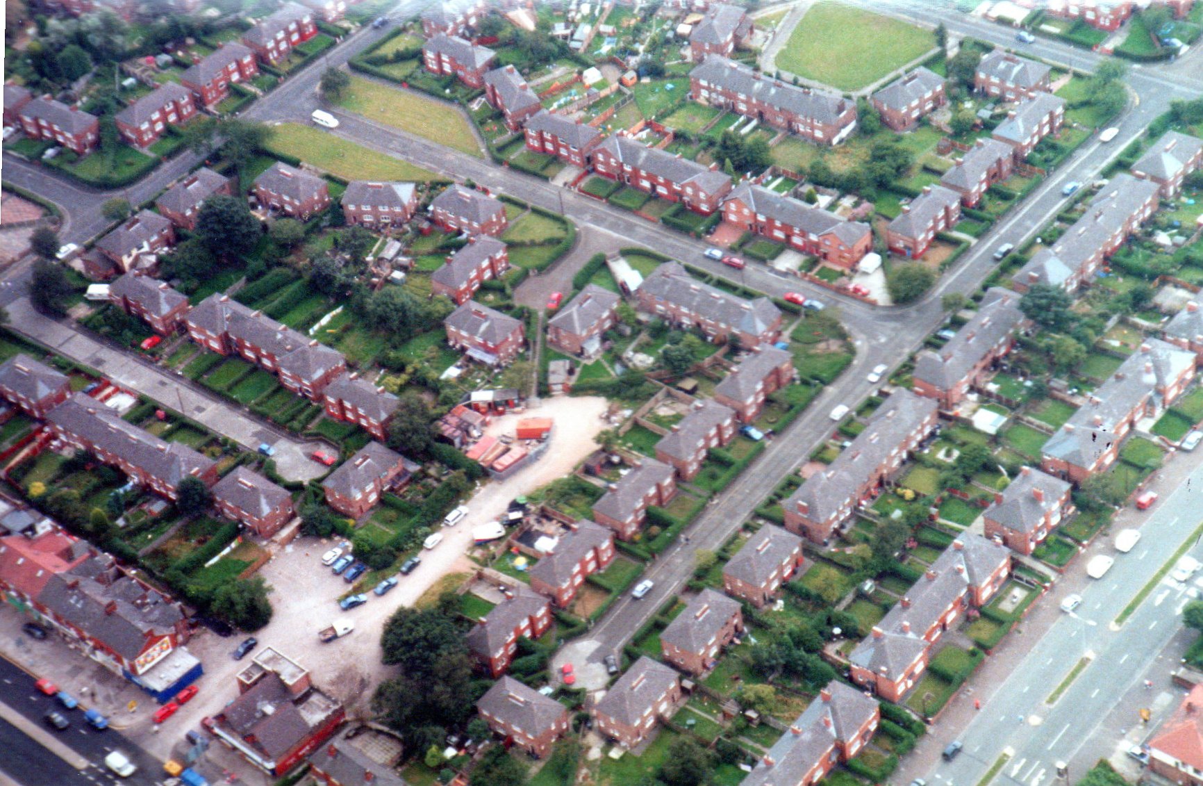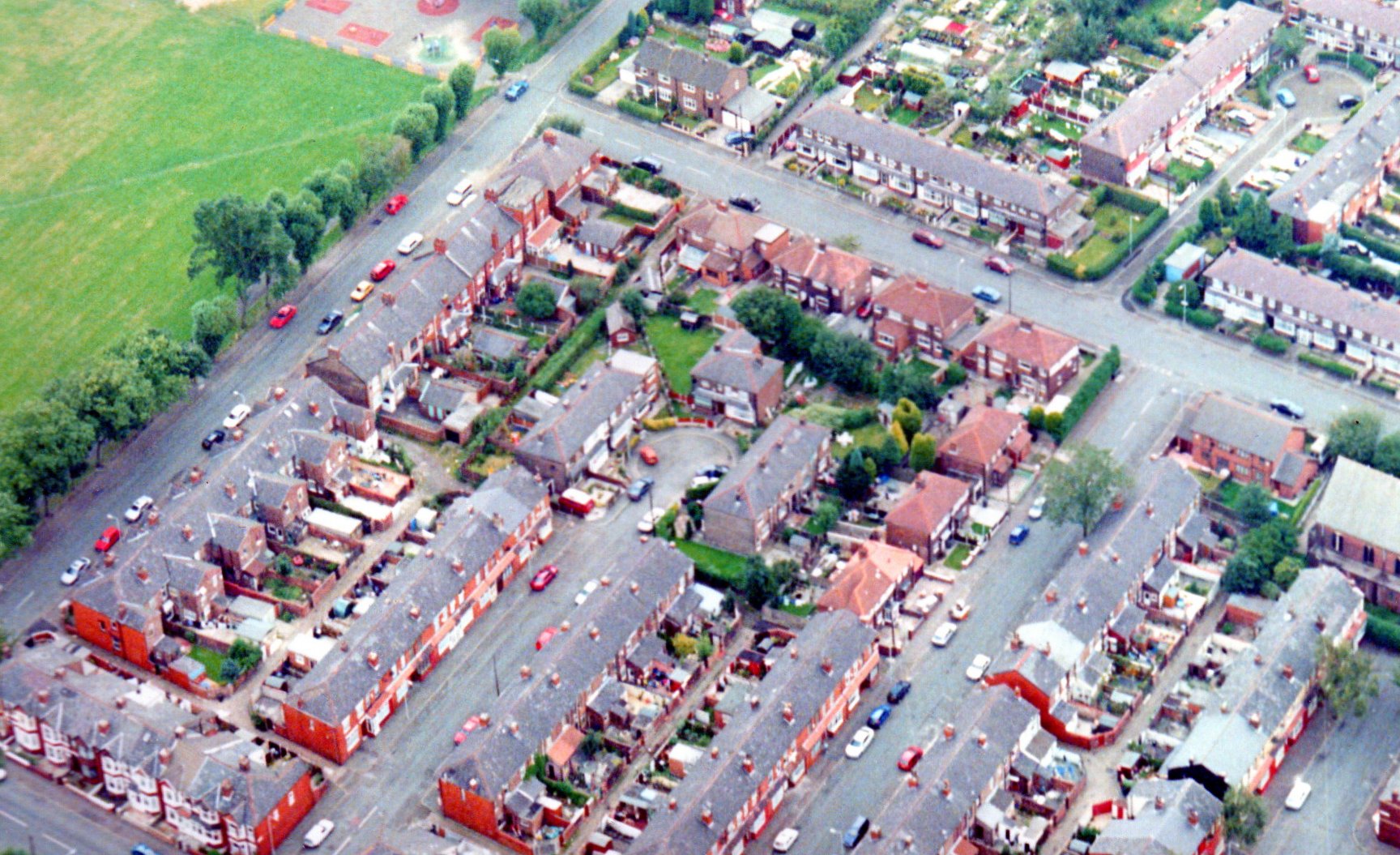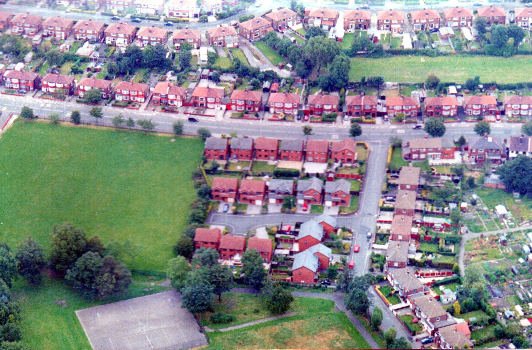 These aerial shots were taken in the late 1990’s and cover most of New Moston. See the caption below each image for more information.