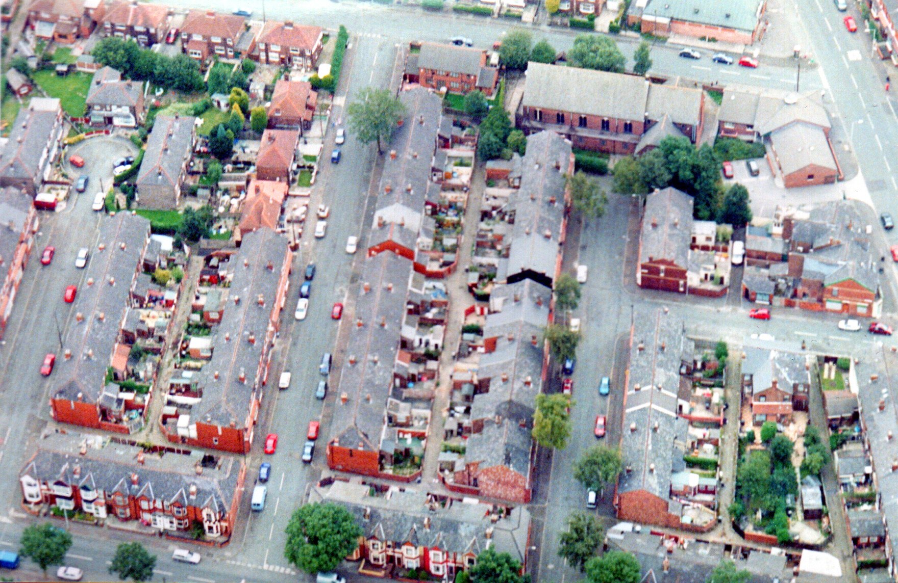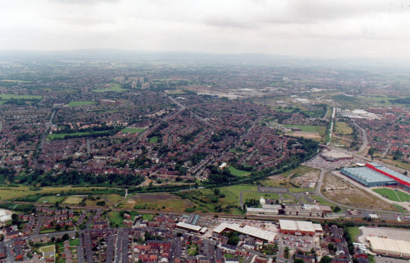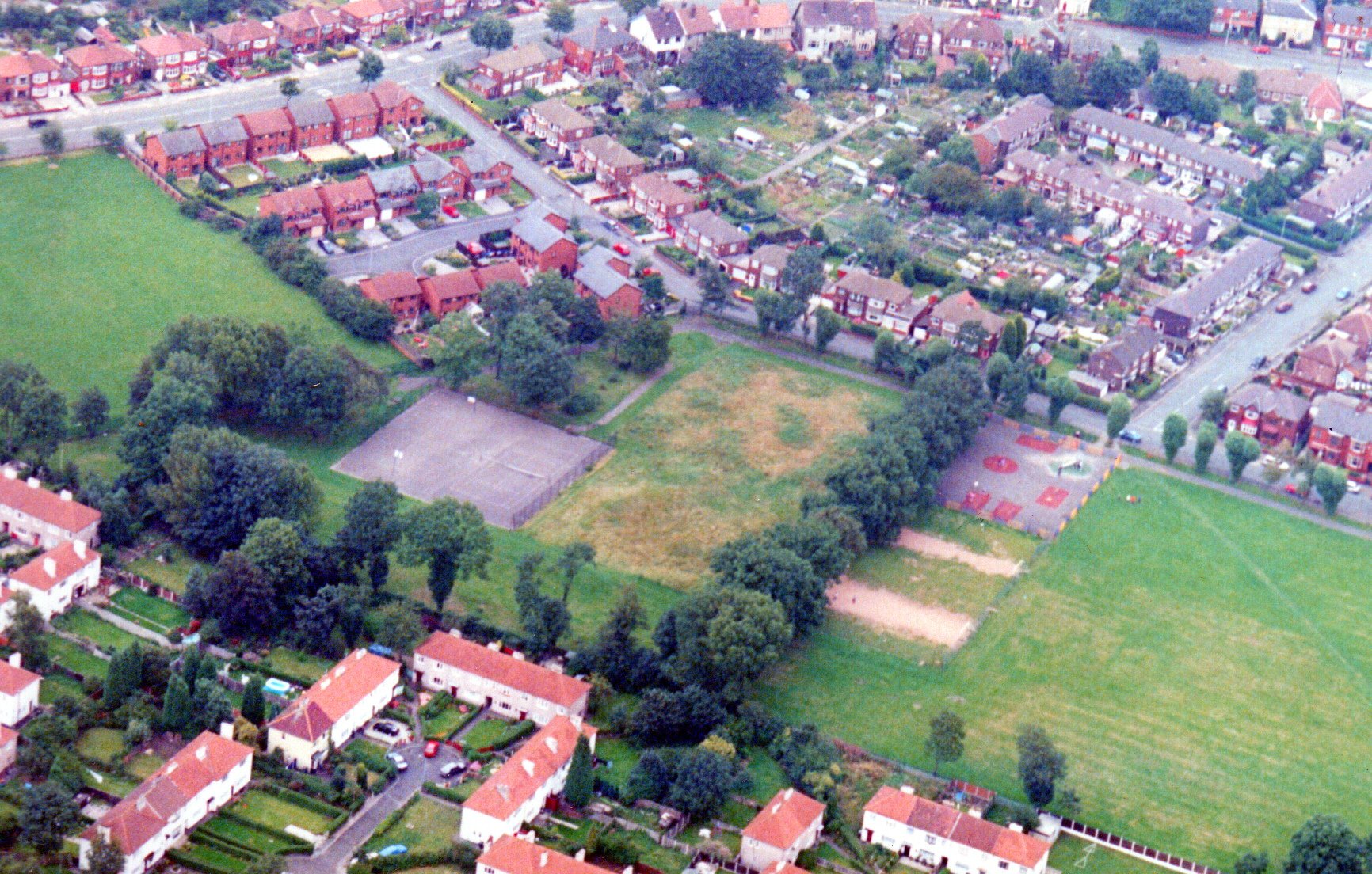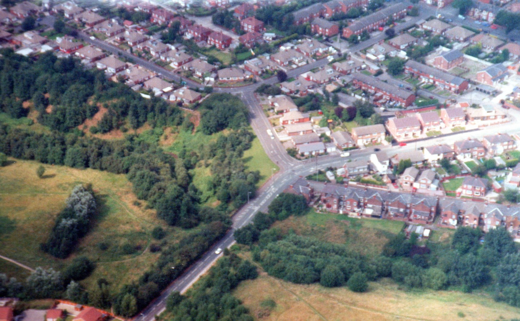 These aerial shots were taken in the late 1990’s and cover most of New Moston. See the caption below each image for more information.